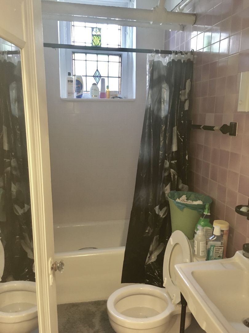 The bathroom has a pretty stained glass window and beautiful lavender tile.