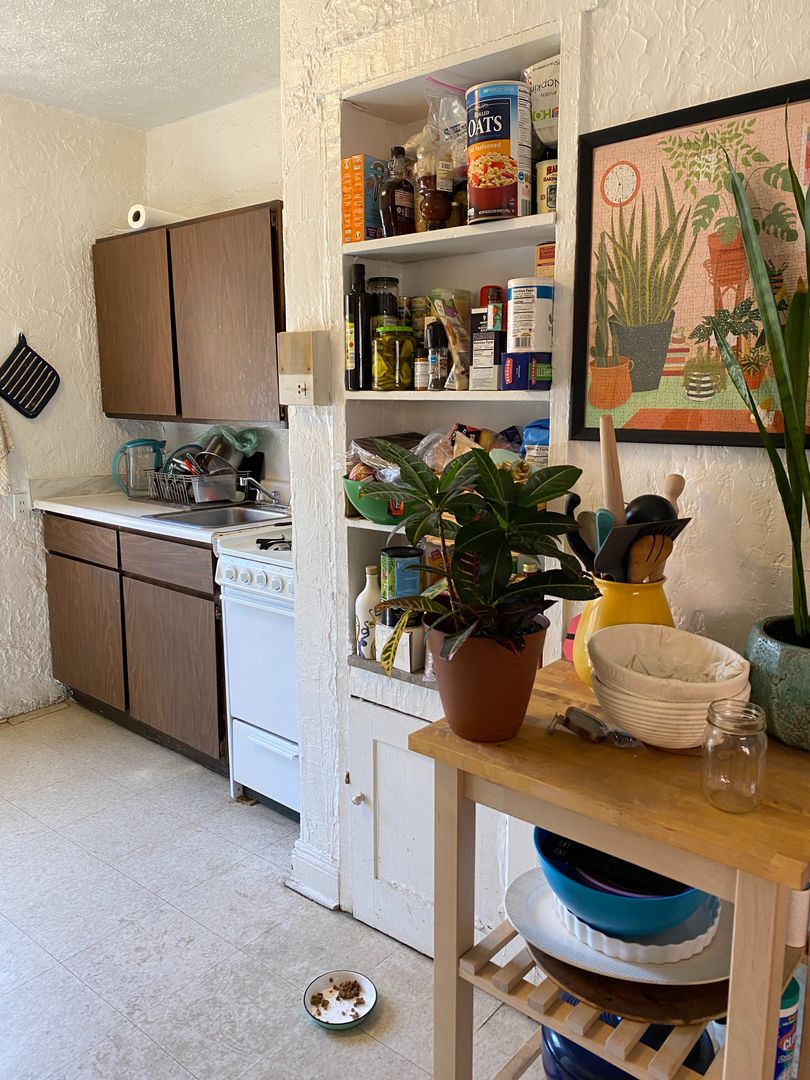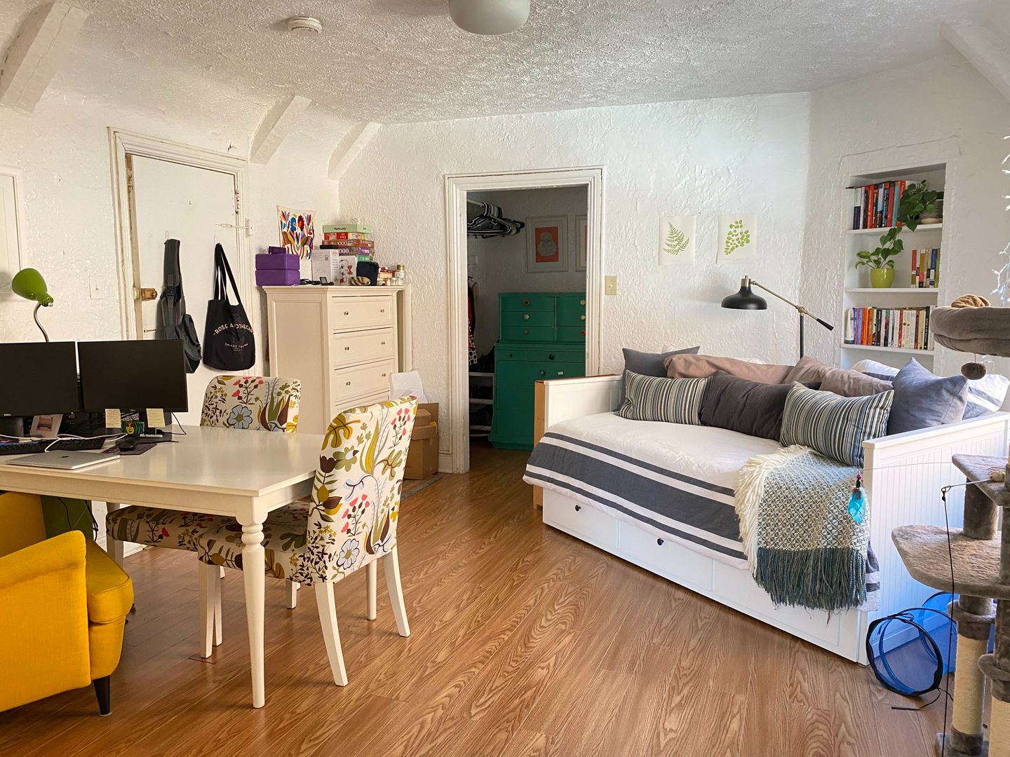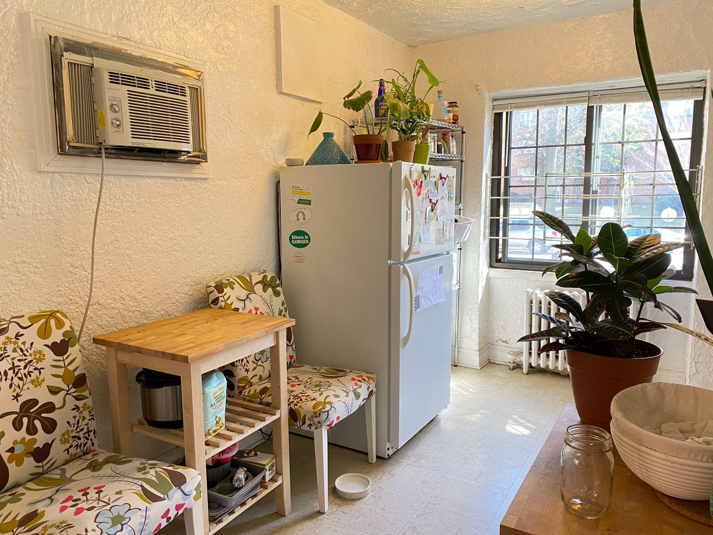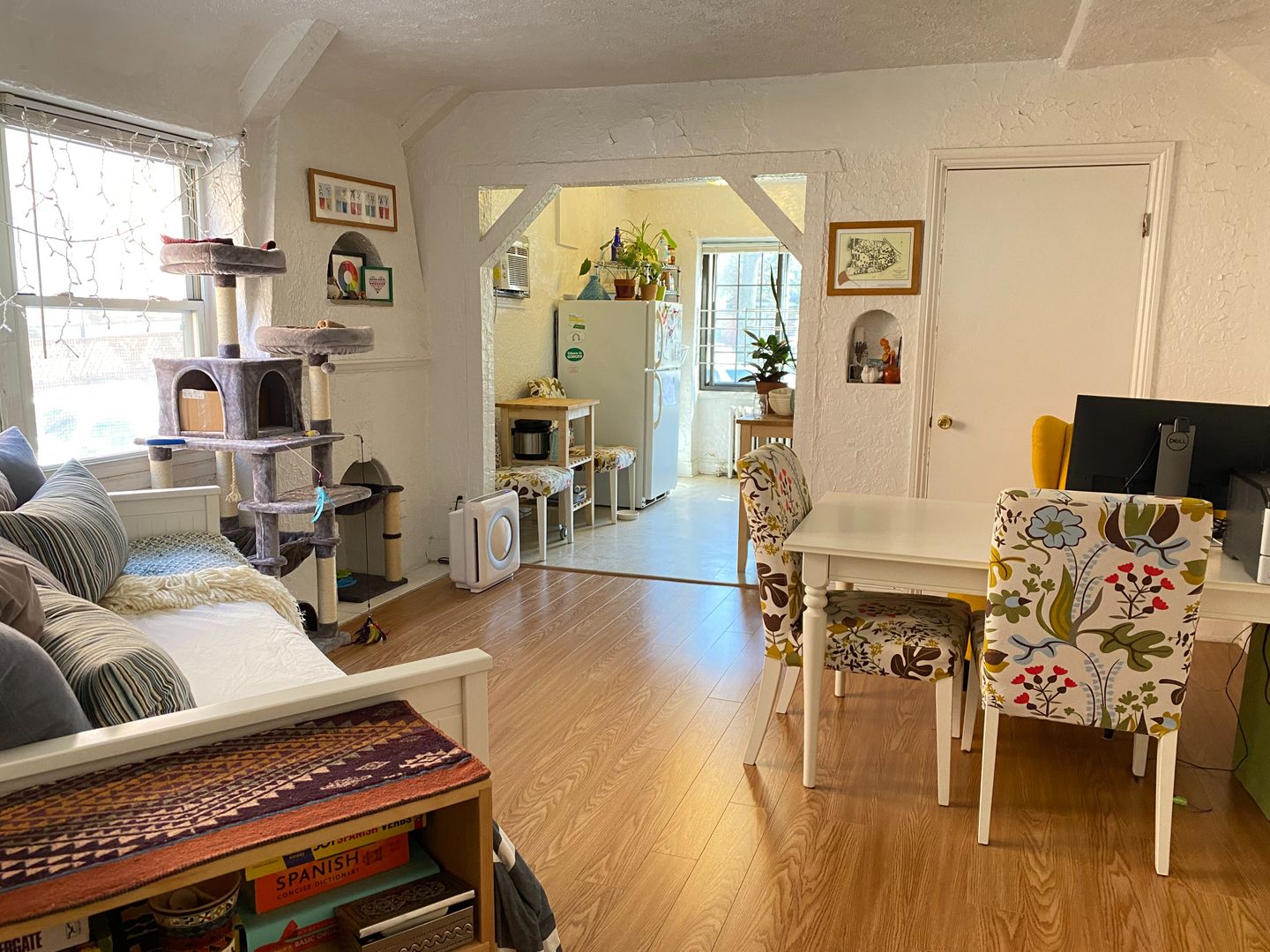 The kitchen has a partition between the appliances and where you would put a table and chairs and because of the partition, most of our tenants put their bed in the kitchen and turn it into a bedroom. Kind of hard to explain, but makes total sense when you see the layout. It's like getting a one bedroom apartment for the price of a studio.