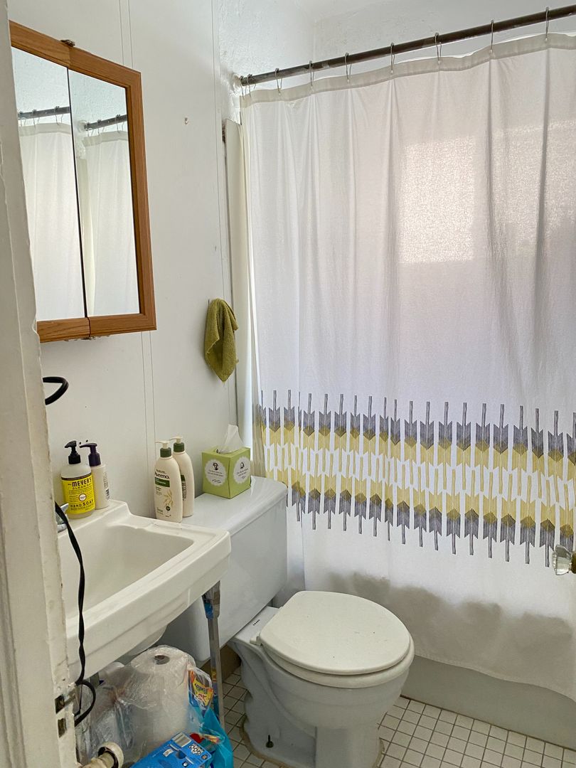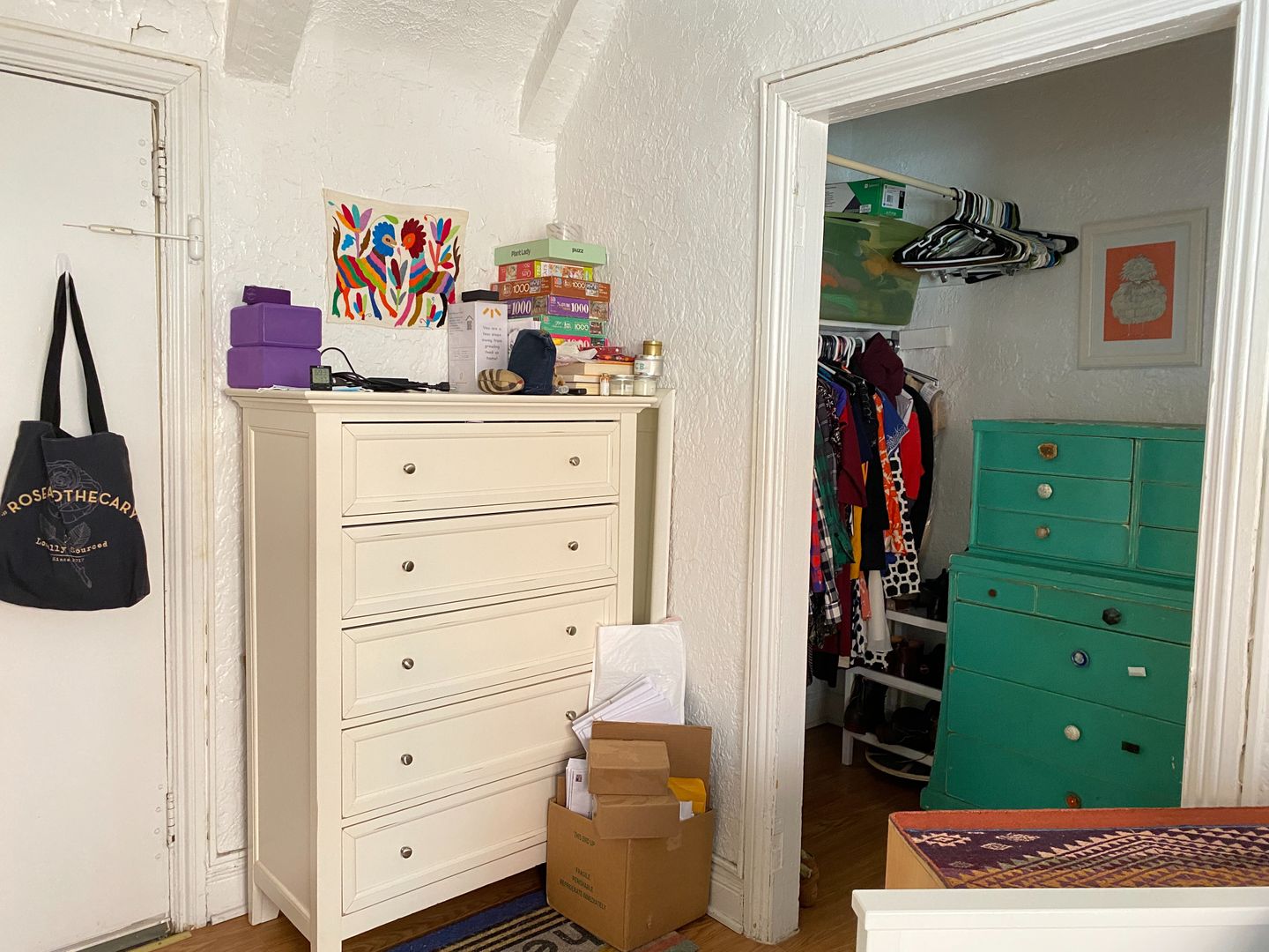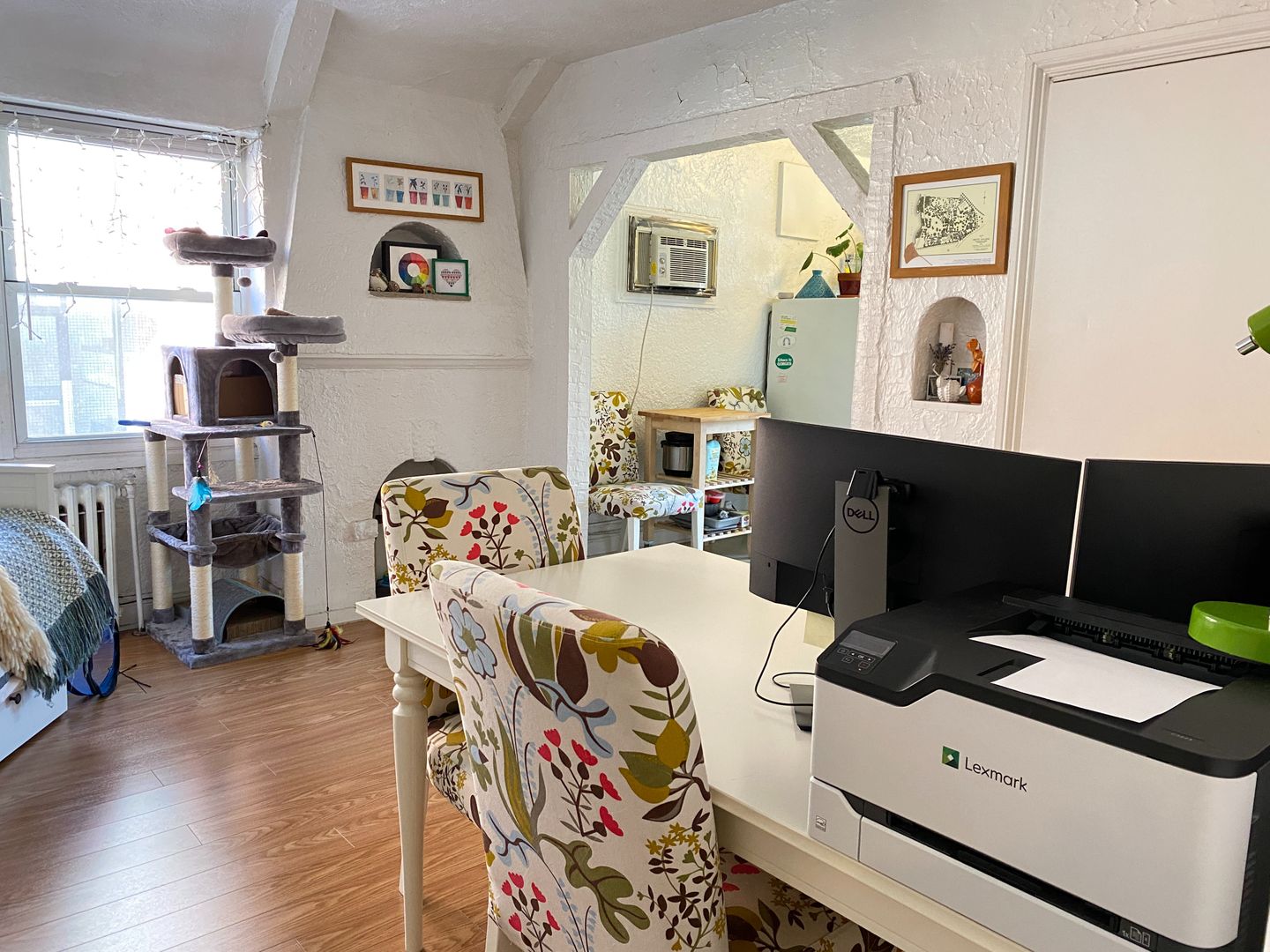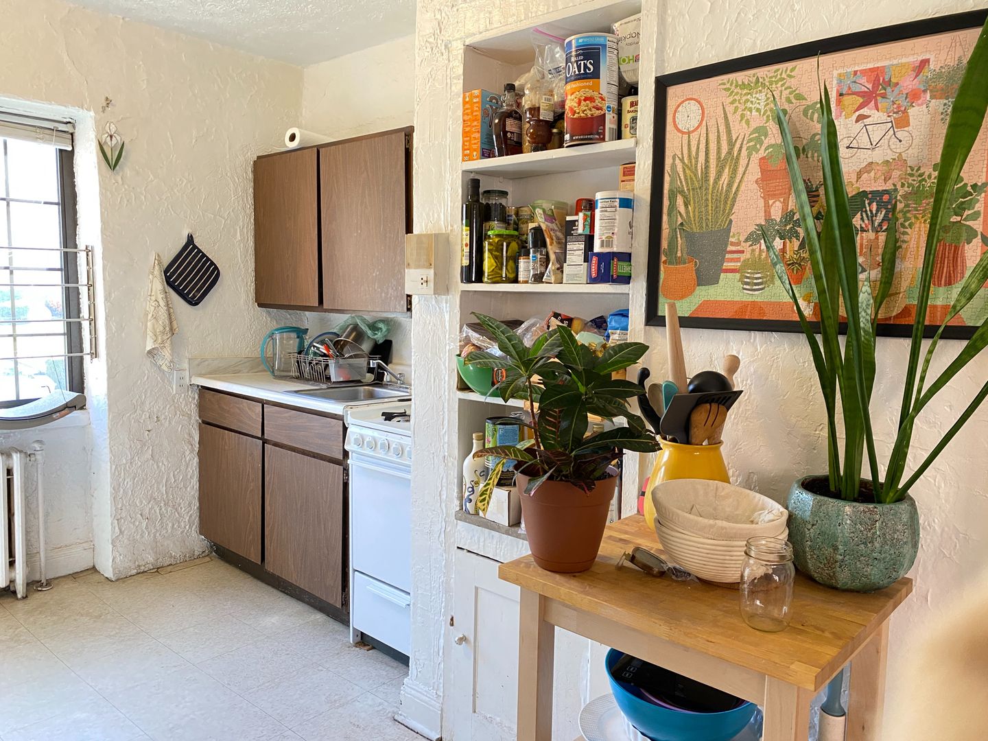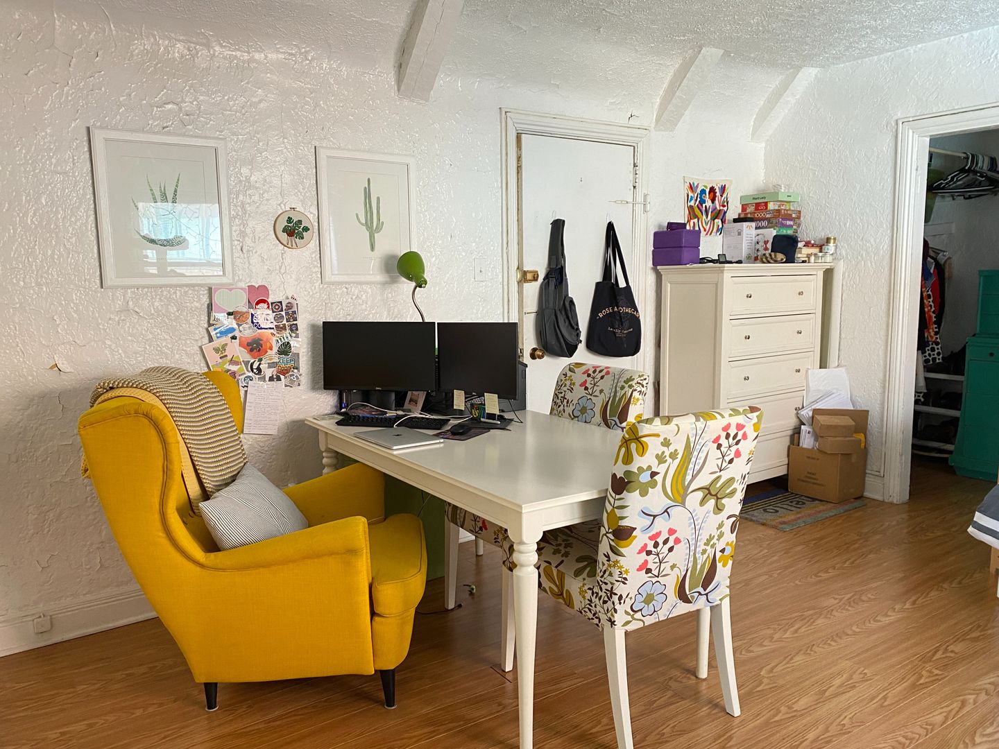 The kitchen has a partition between the appliances and where you would put a table and chairs and because of the partition, most of our tenants put their bed in the kitchen and turn it into a bedroom. Kind of hard to explain, but makes total sense when you see the layout. It's like getting a one bedroom apartment for the price of a studio.