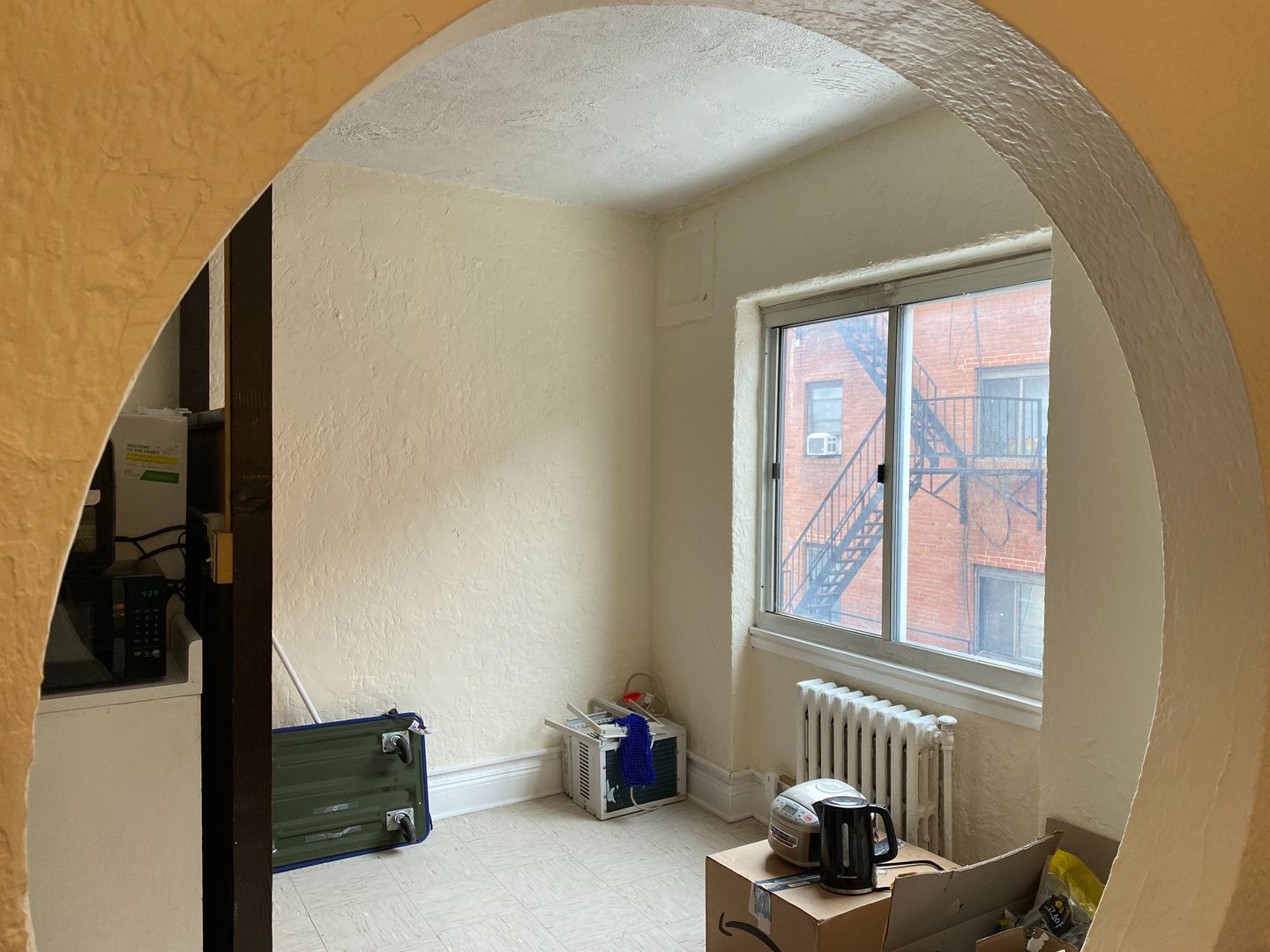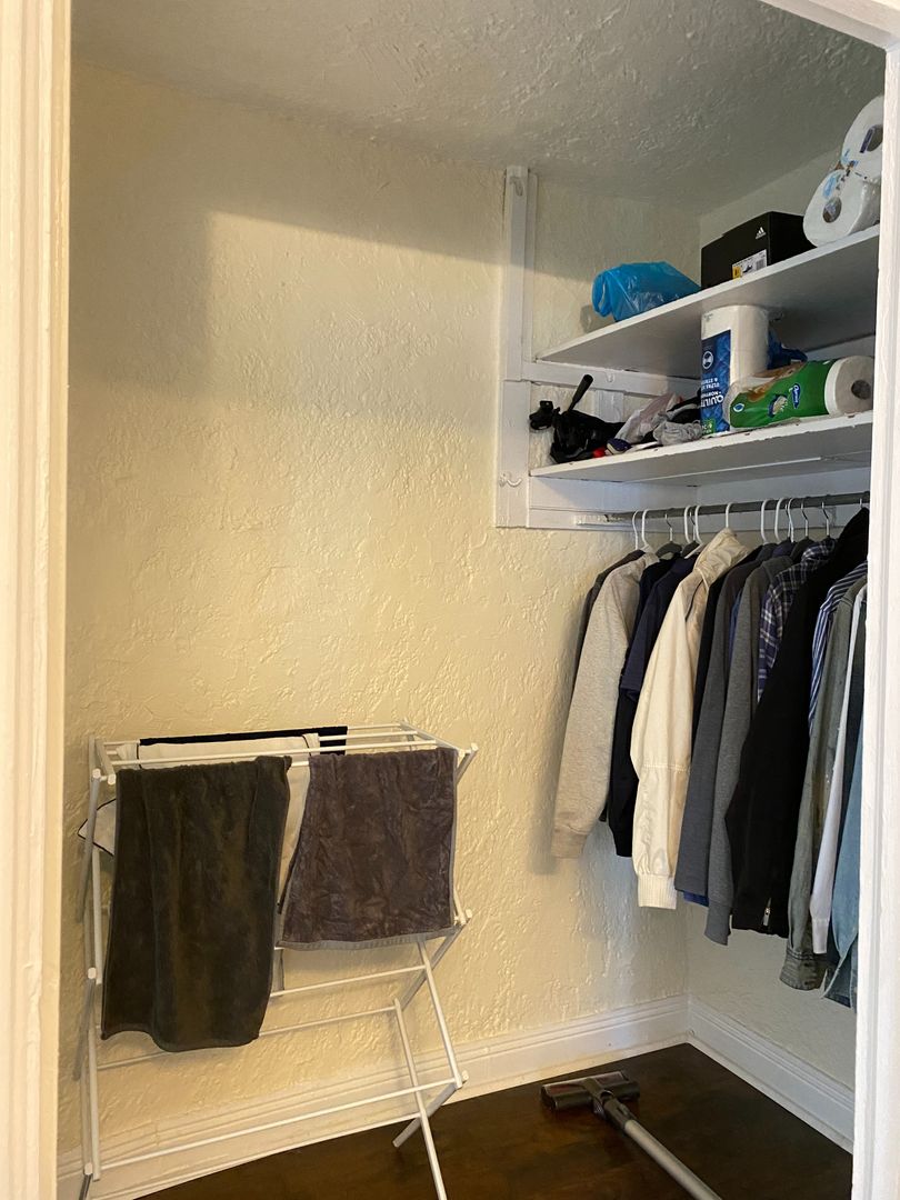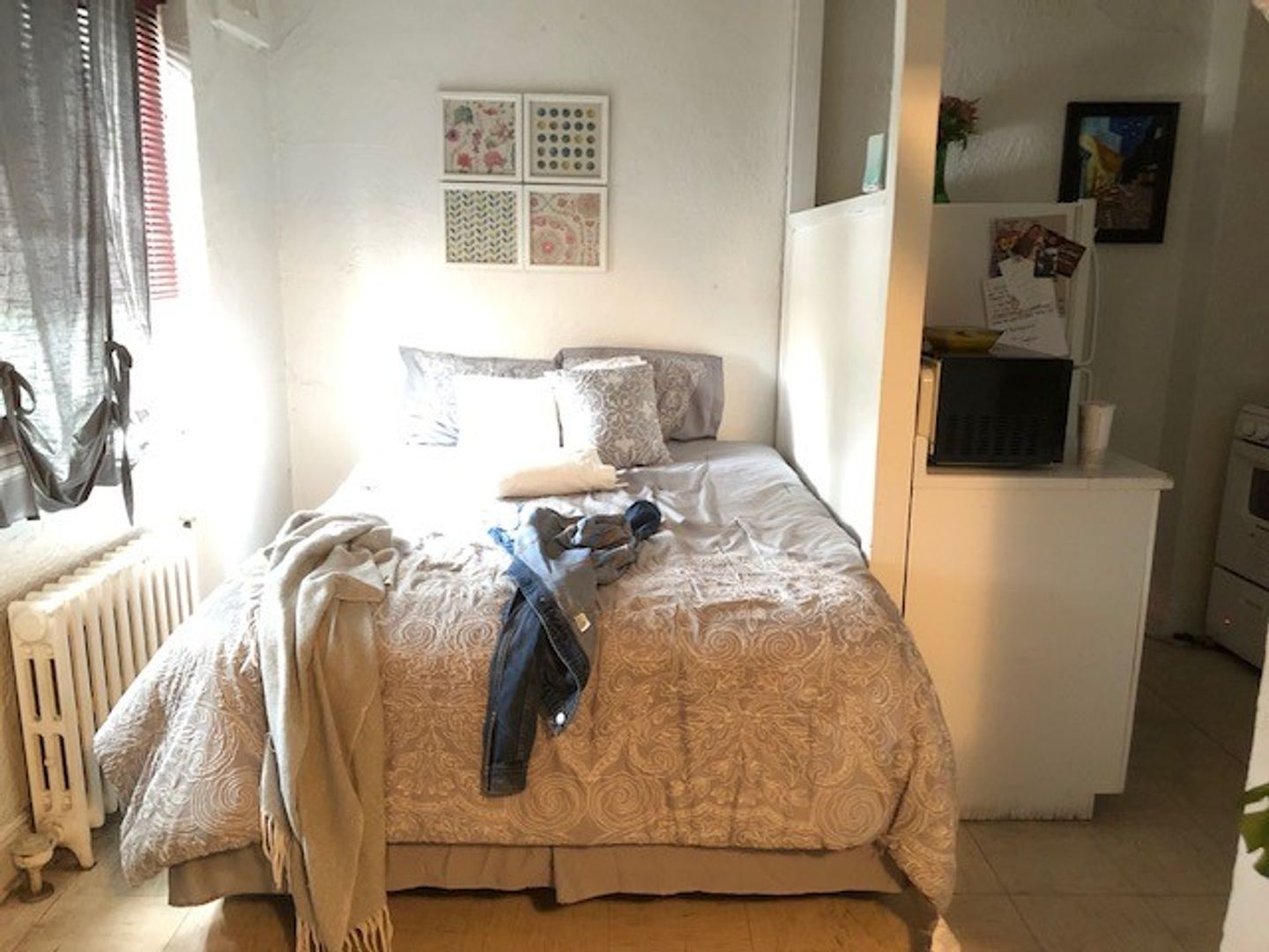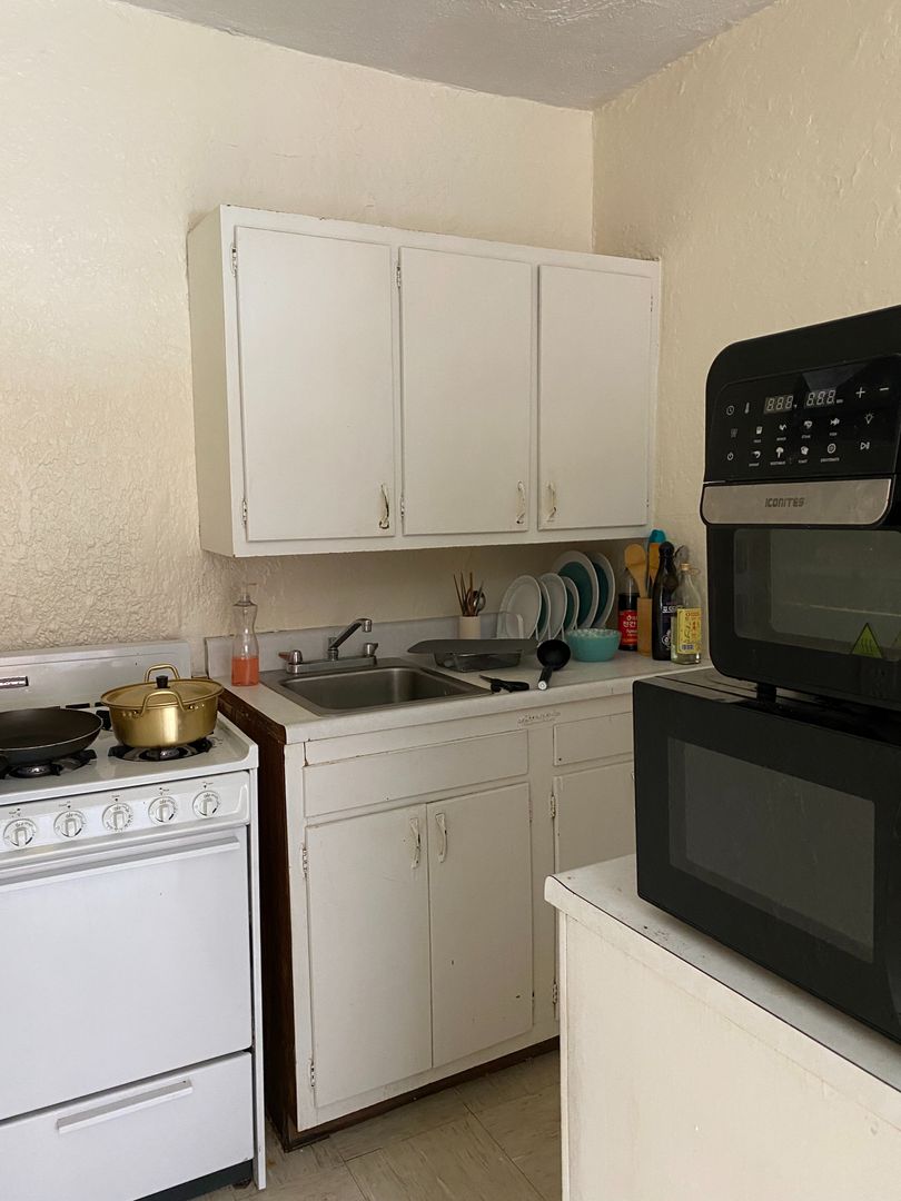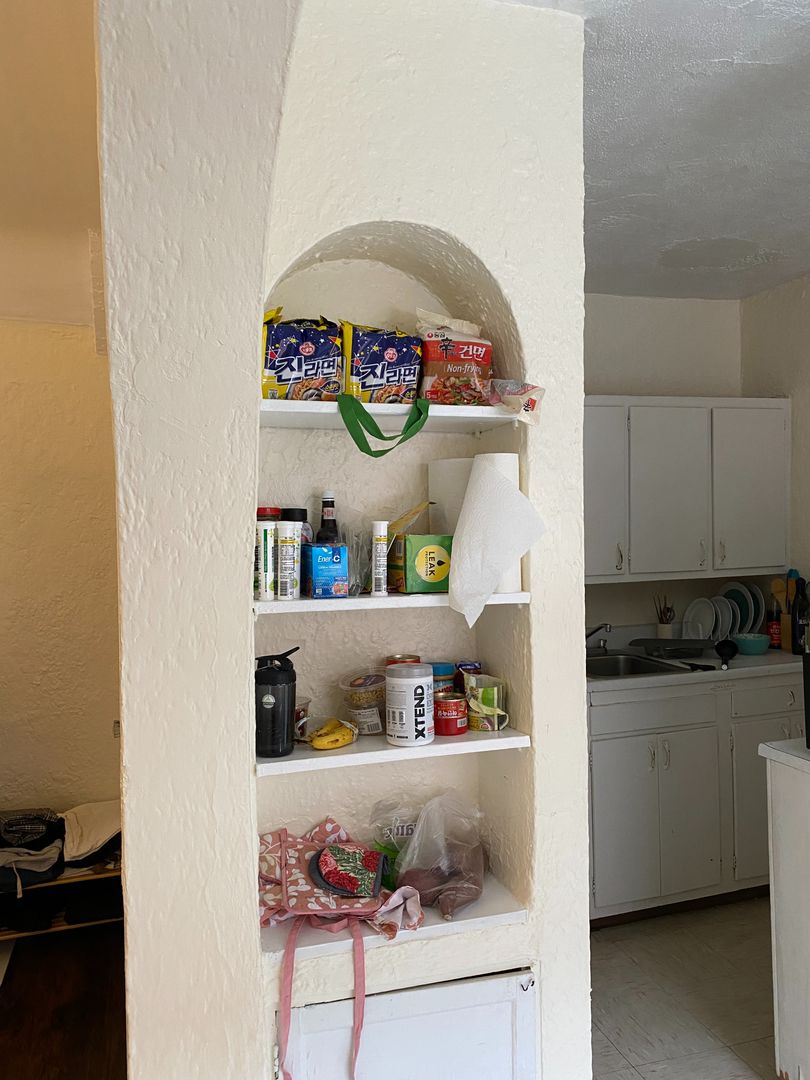 The kitchen has plenty of room for a table and chairs! It has a divider so you can see in the photos most tenants in the studios use the dining room for their bedroom. It fits a queen bed perfectly. Beautiful arch doorway to the kitchen/dining room.