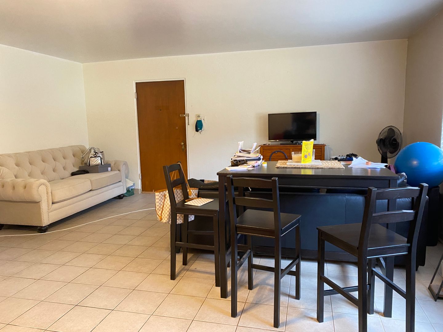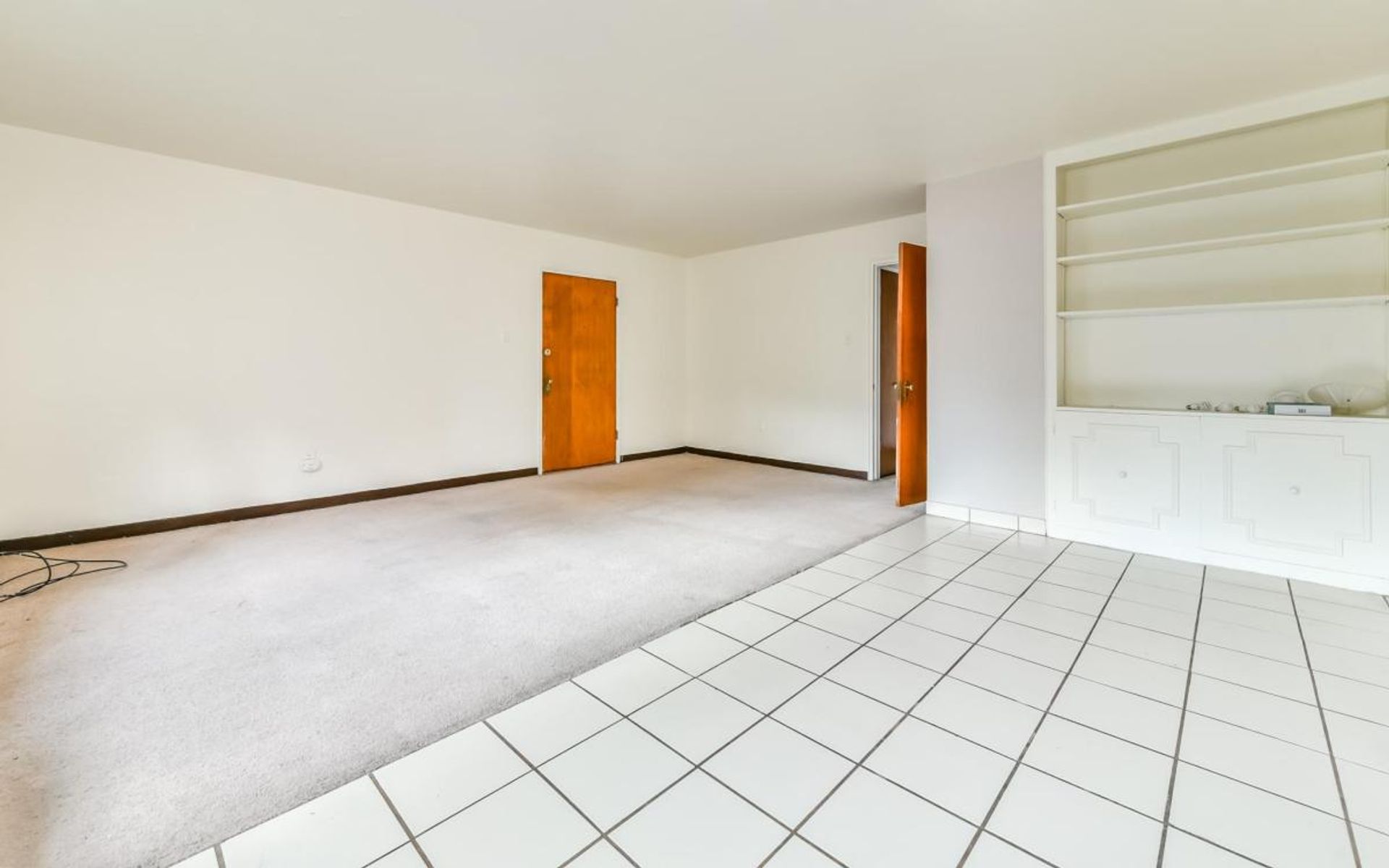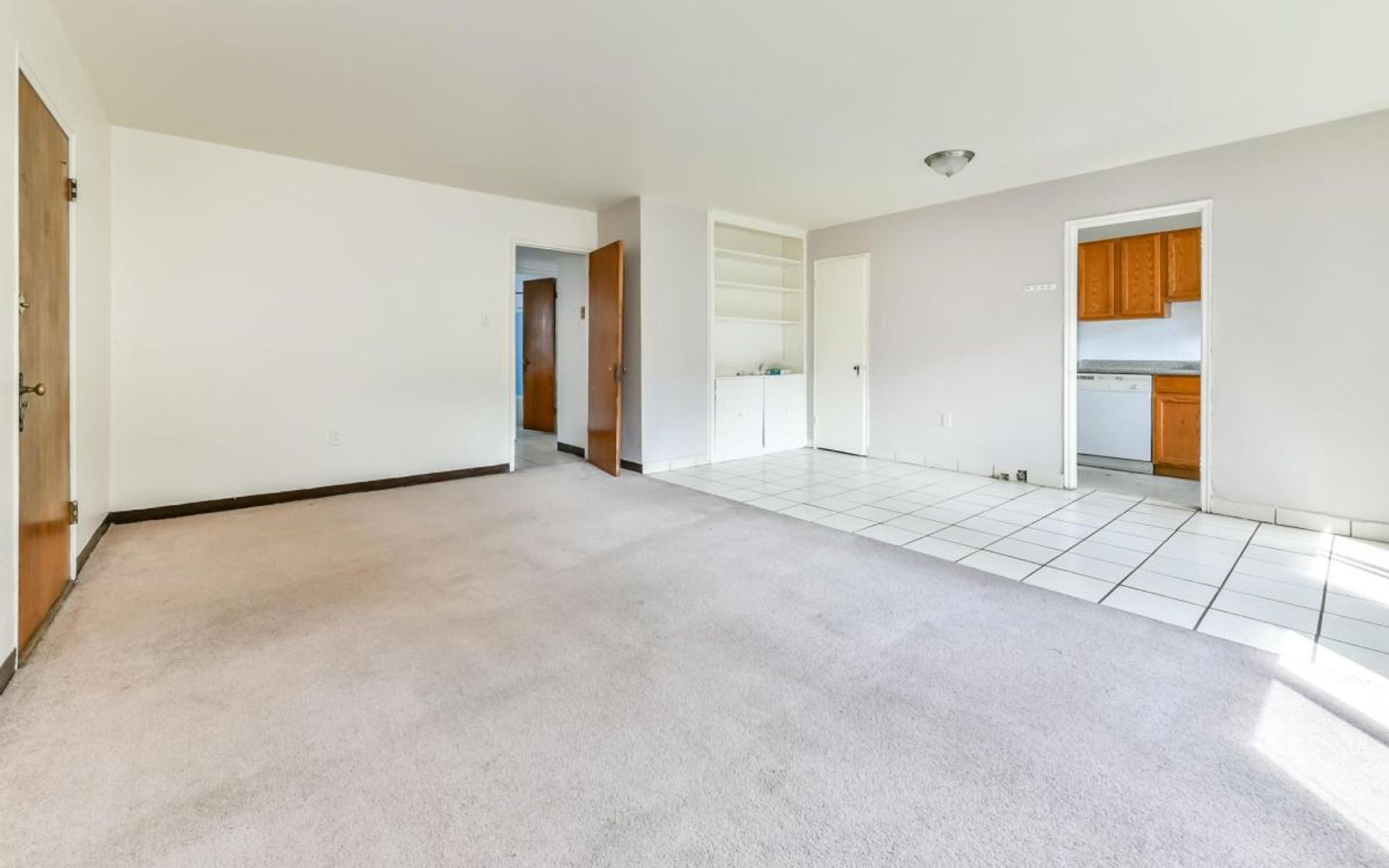 This apartment has all cream white tile which is easy to clean and brightens the room. The kitchen is service-only, but features a lot of cabinets and a dishwasher. The bedrooms have comfortable beige carpeting.