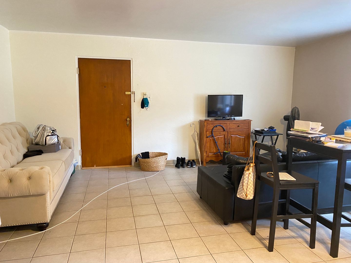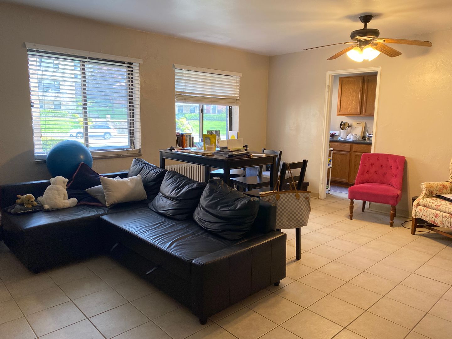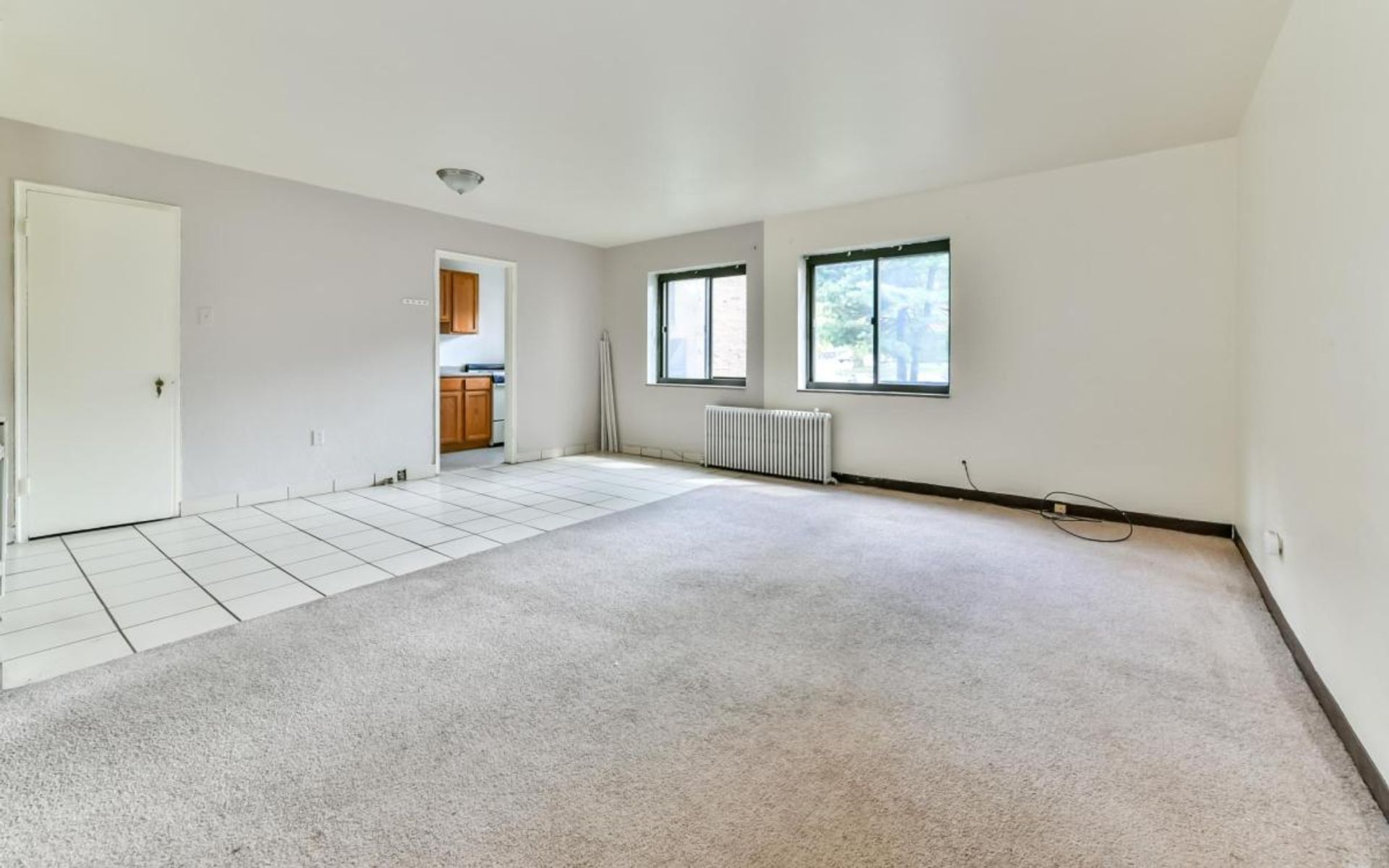 This apartment has all cream white tile which is easy to clean and brightens the room. The kitchen is service-only, but features a lot of cabinets and a dishwasher. The bedrooms have comfortable beige carpeting.