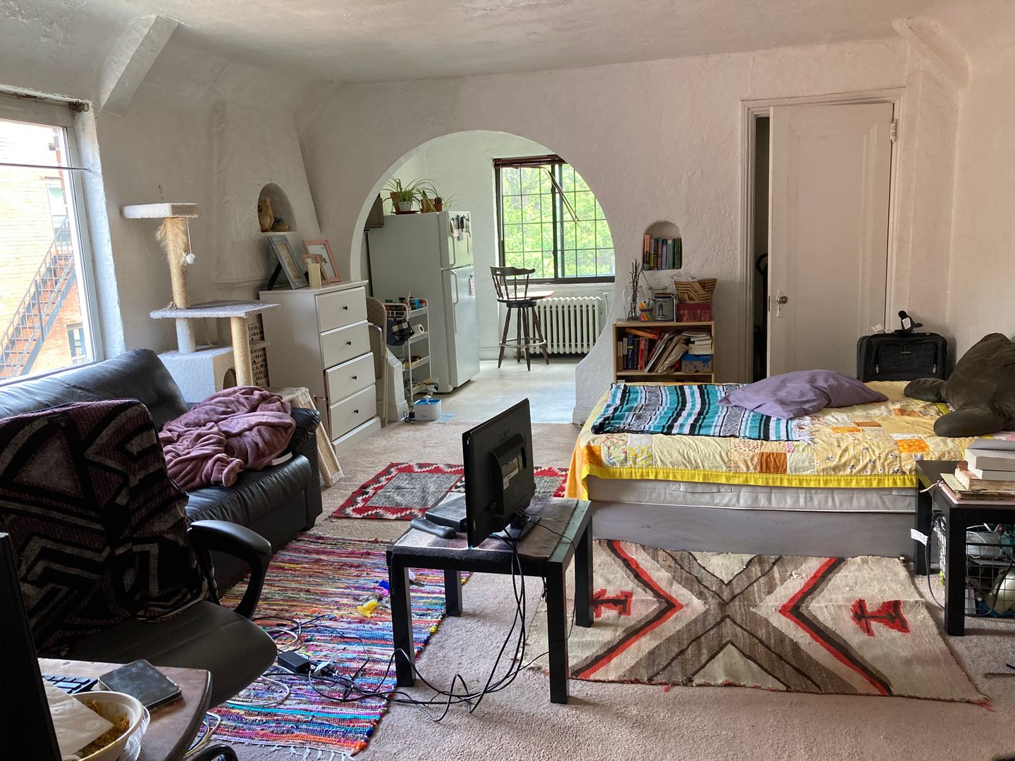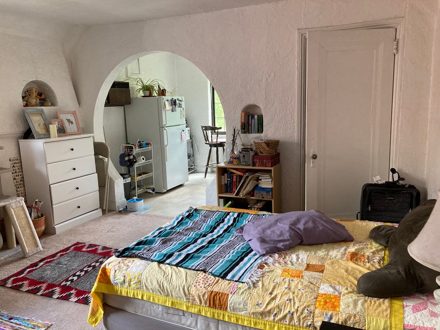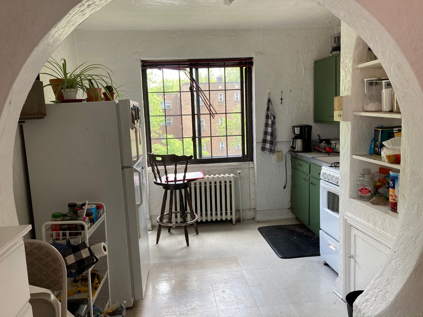 The kitchen has a partition between the appliances and where you would put a table and chairs and because of the partition, most of our tenants put their bed in the kitchen and turn it into a bedroom. Kind of hard to explain, but makes total sense when you see the layout. It's like getting a one bedroom apartment for the price of a studio.
