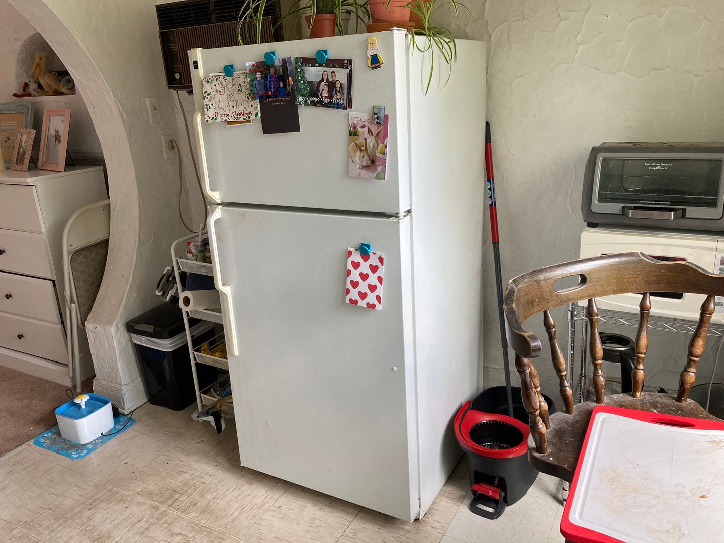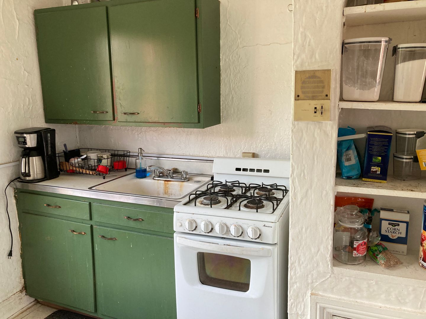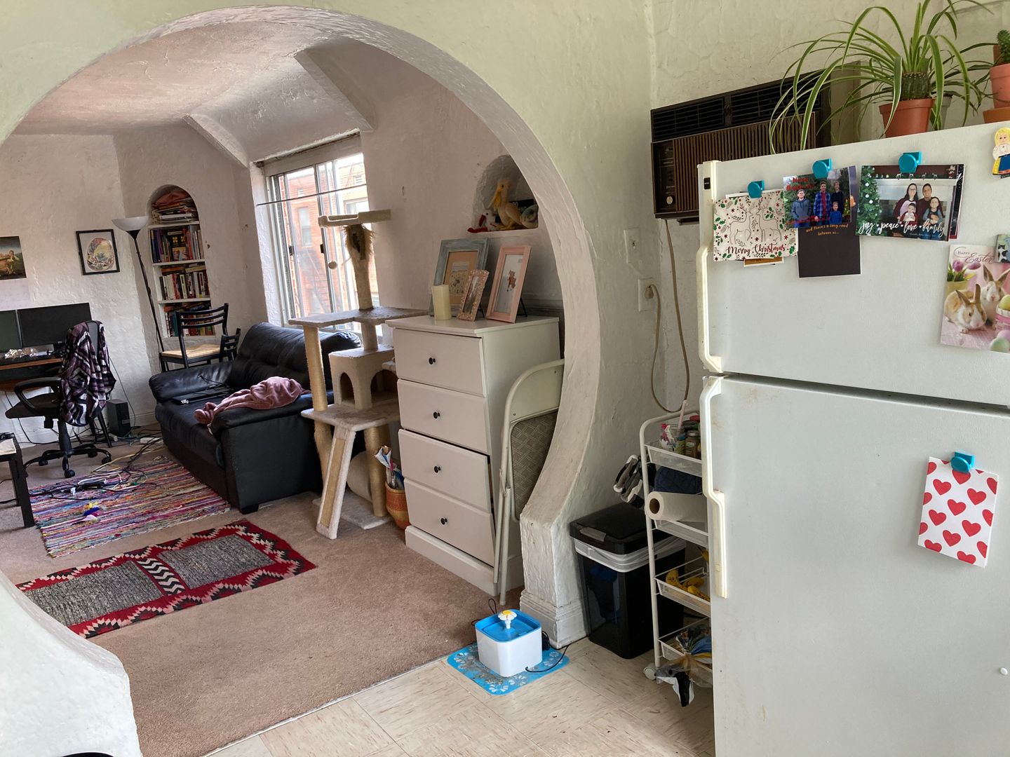 The kitchen has a partition between the appliances and where you would put a table and chairs and because of the partition, most of our tenants put their bed in the kitchen and turn it into a bedroom. Kind of hard to explain, but makes total sense when you see the layout. It's like getting a one bedroom apartment for the price of a studio.