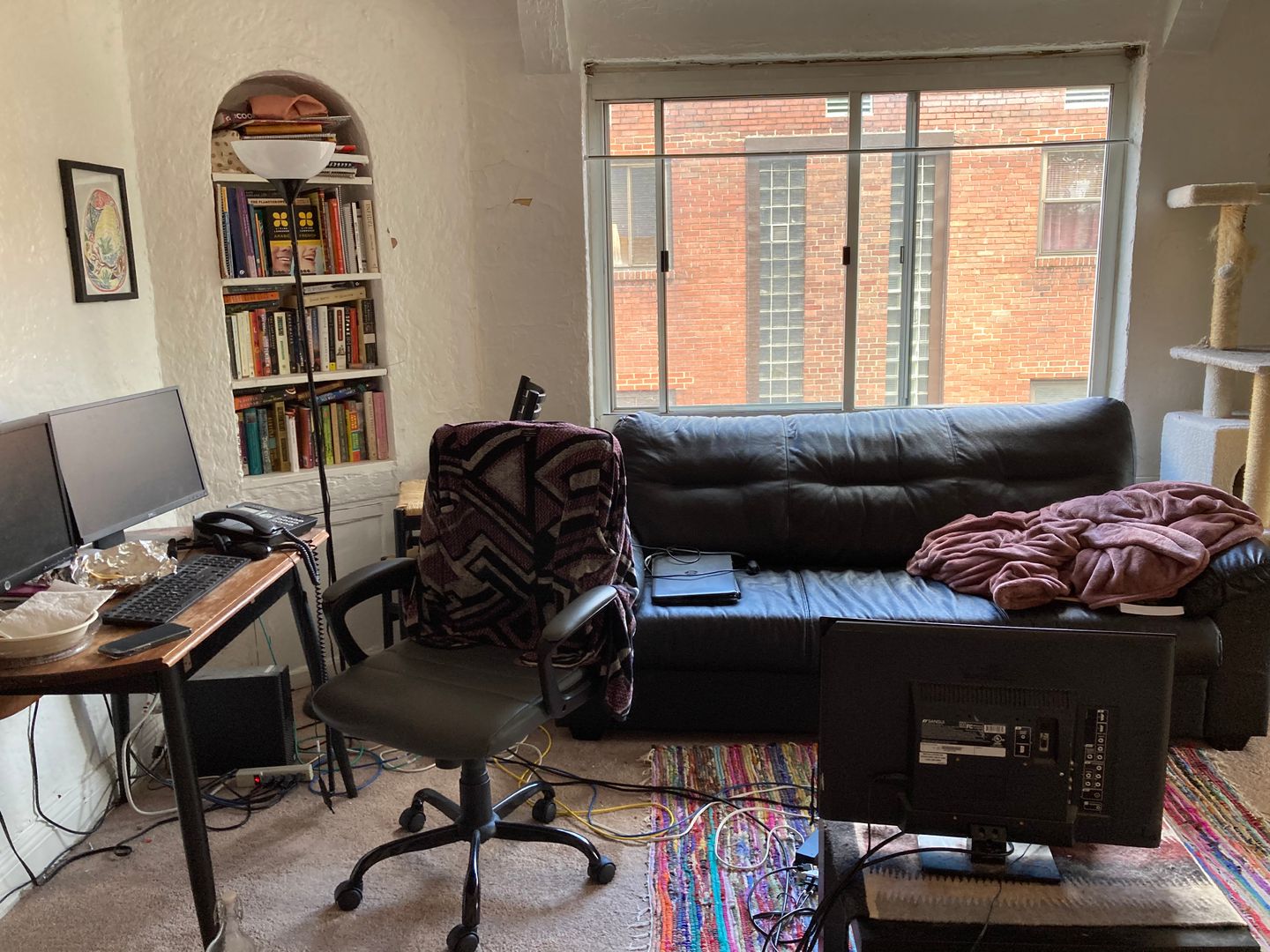 There are tons of built-in shelves in the living room!